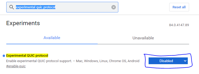 2. 검색창에 experimental quic protocol 를 입력합니다. 그리고 "Default"를 "Disabled"로 설정해줍니다.